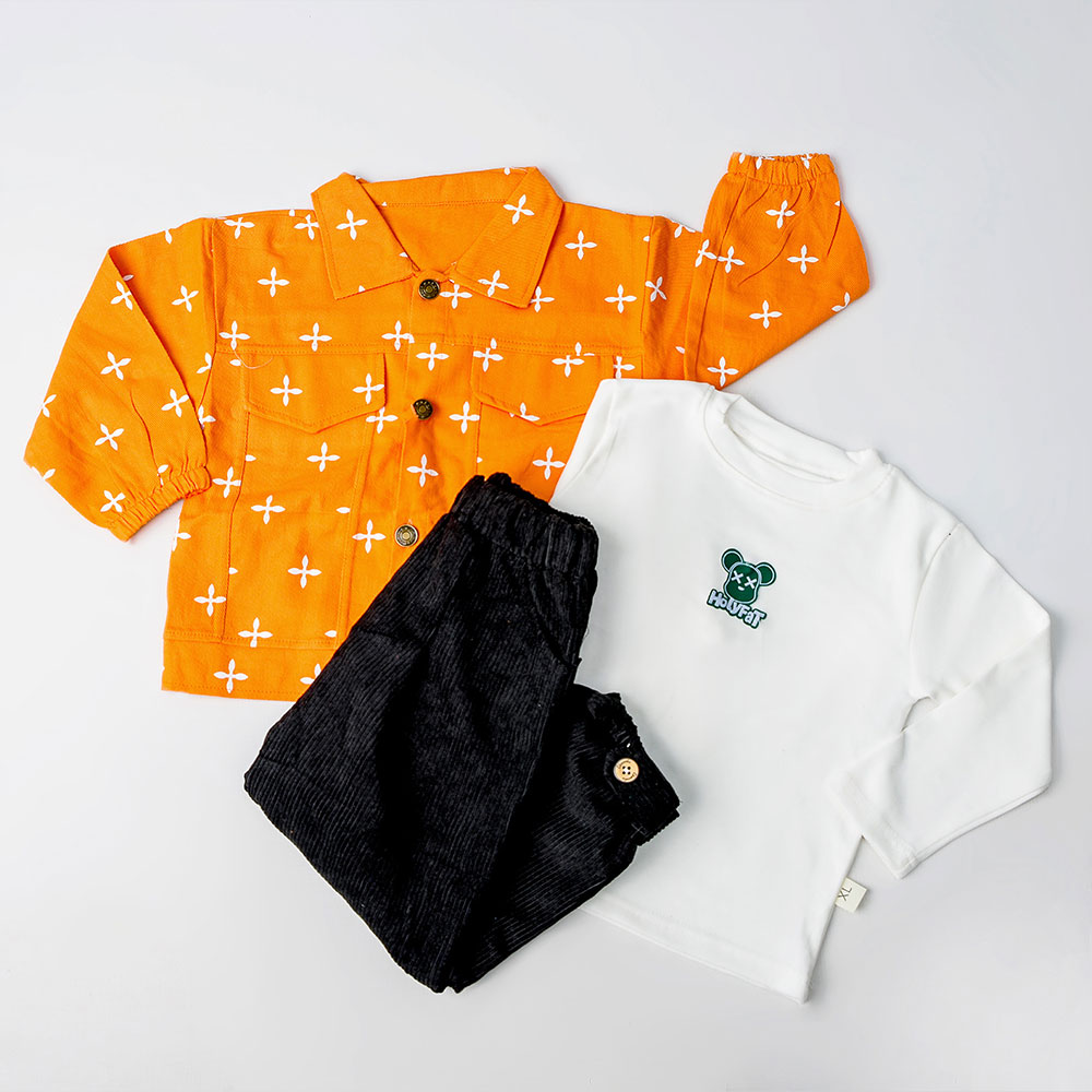 Get this amazing 3 Piece Set with corduroy pants, denim shirt and cotton long sleeve sweater.